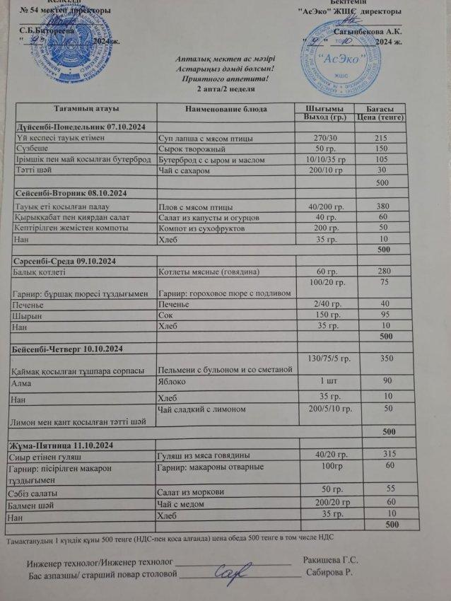 Апталық ас мәзірі 07.10.-11.10.2024ж » №54 орта мектебі