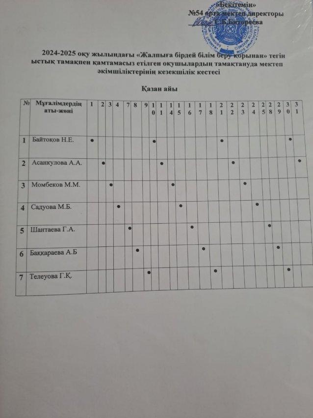 01 октябрь 2024 0 1 2 3 4 5 Тегін ыстық тамақпен қамтамасыз етілген оқушылардың тамақтануда мектеп әкімшілігінің кезекшілік кестесі