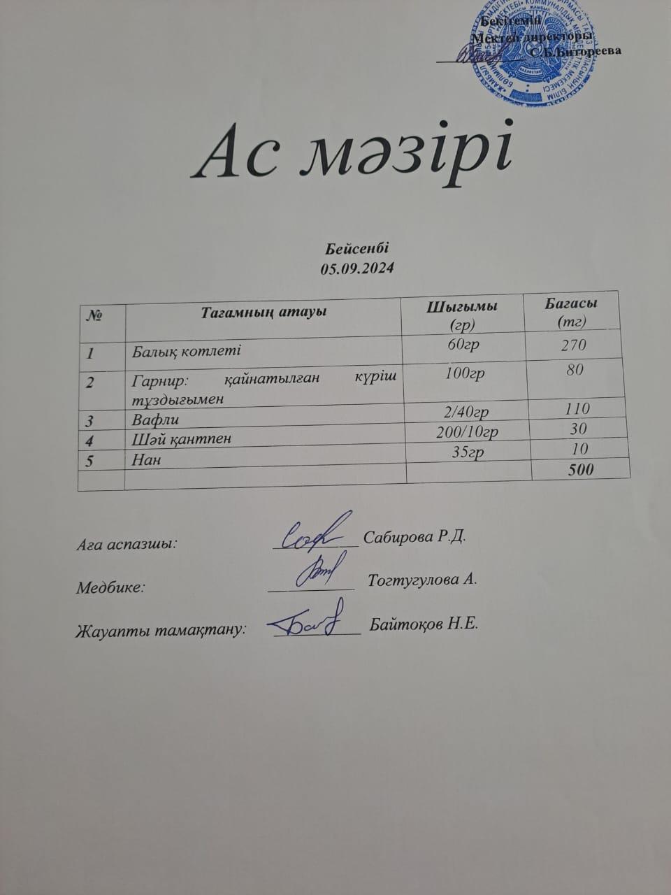 Күнделікті ас мәзірі 05.09.2024ж