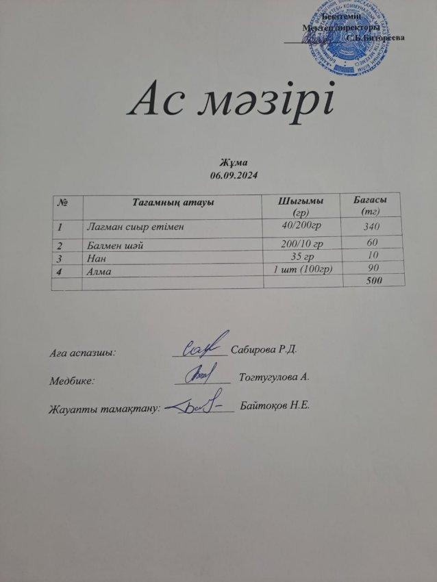 Күнделікті ас мәзірі 05.09.2024ж