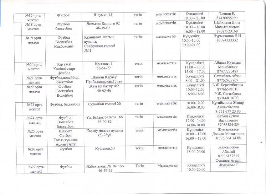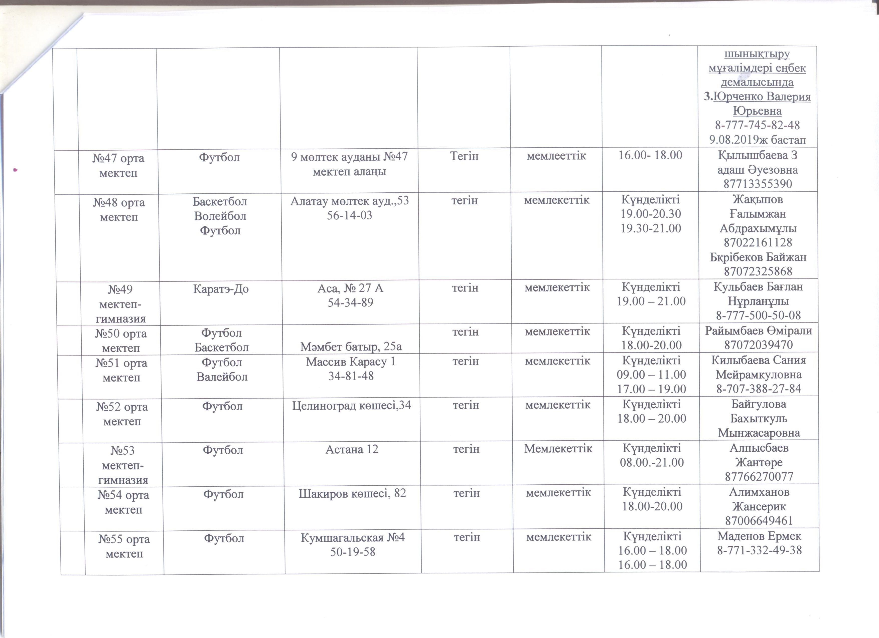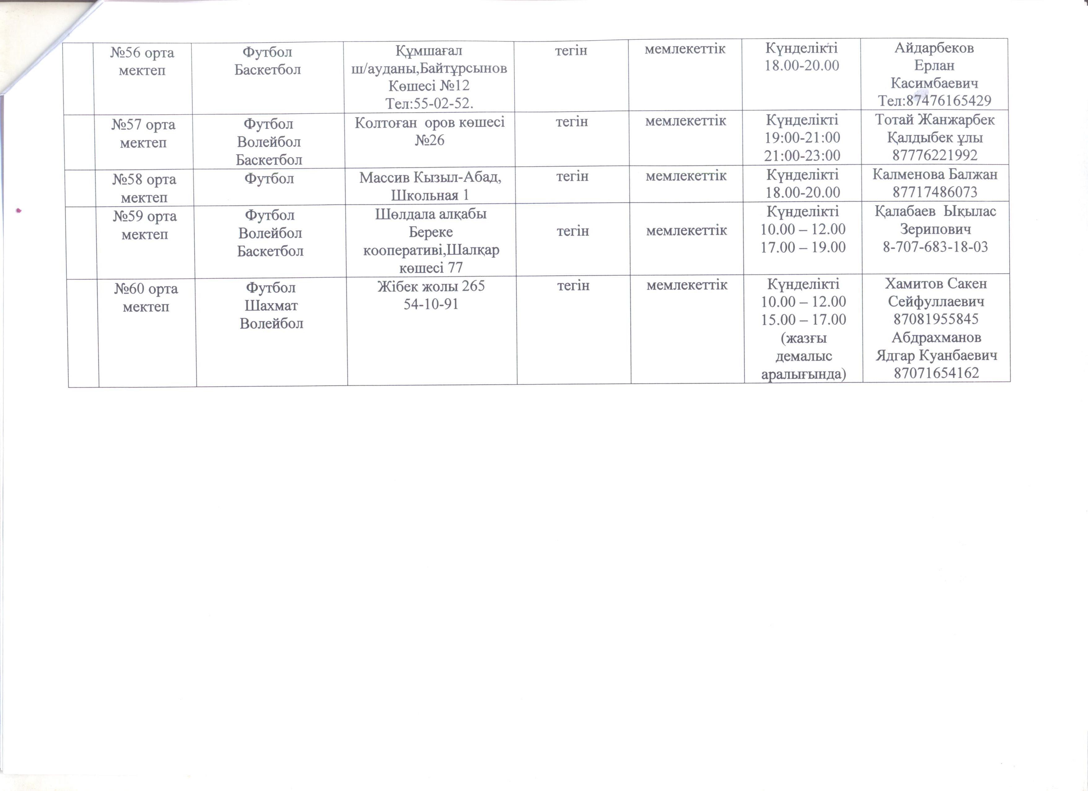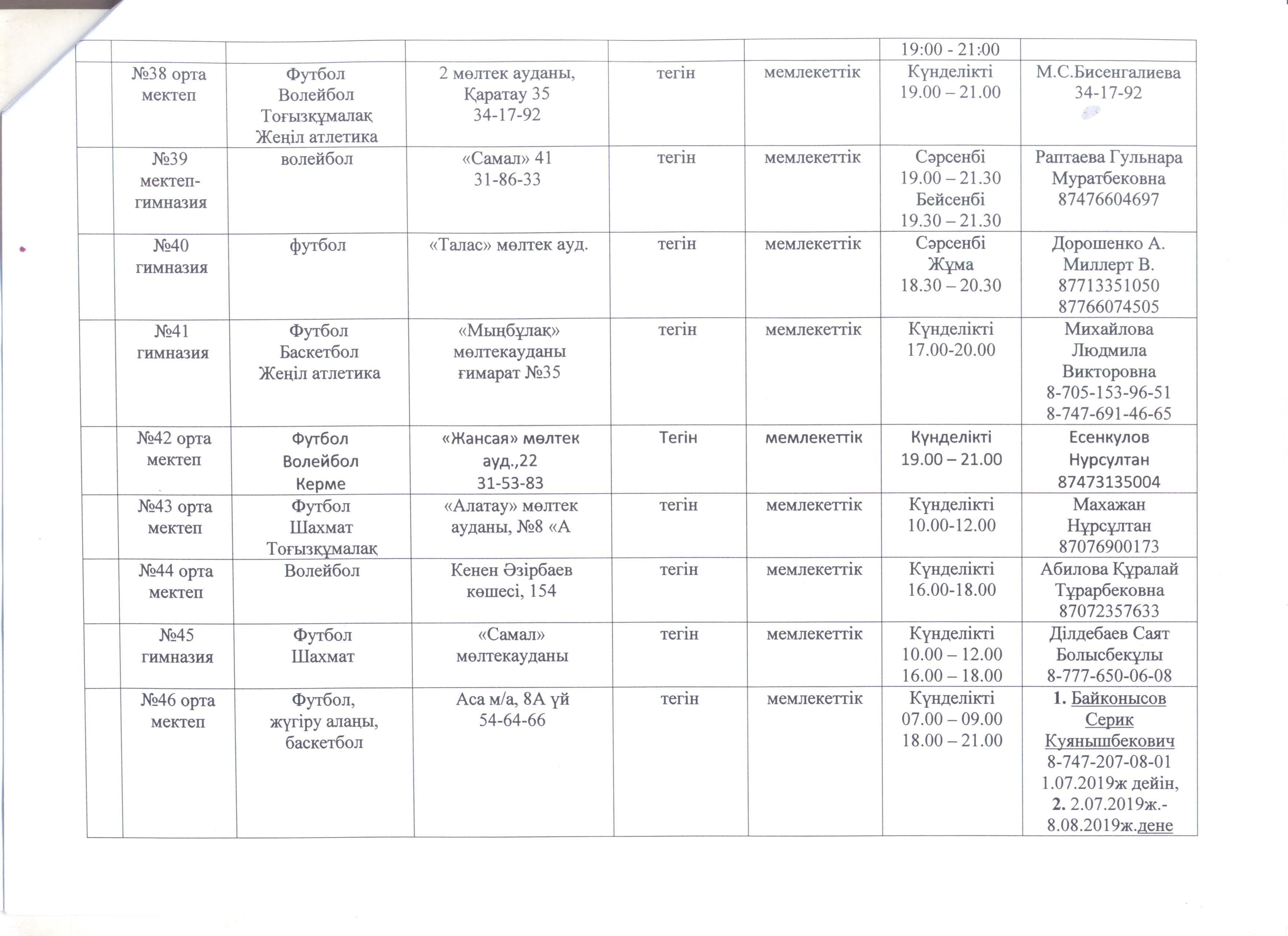 Білім беру мекемелерінде орналасқан спорт алаңшаларының тұрғындарға қол жетімді болуын қамтамассыз ету мақсатында мектебімізде маусым-тамыз айларына арналған жұмыс кестесі