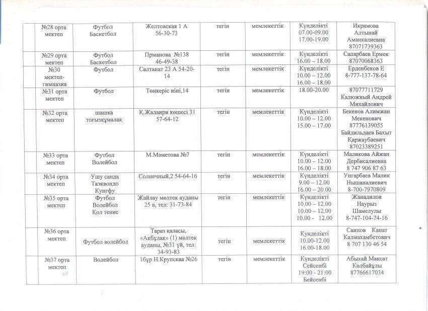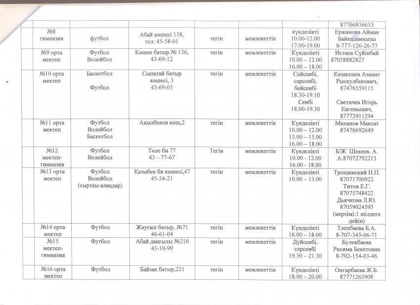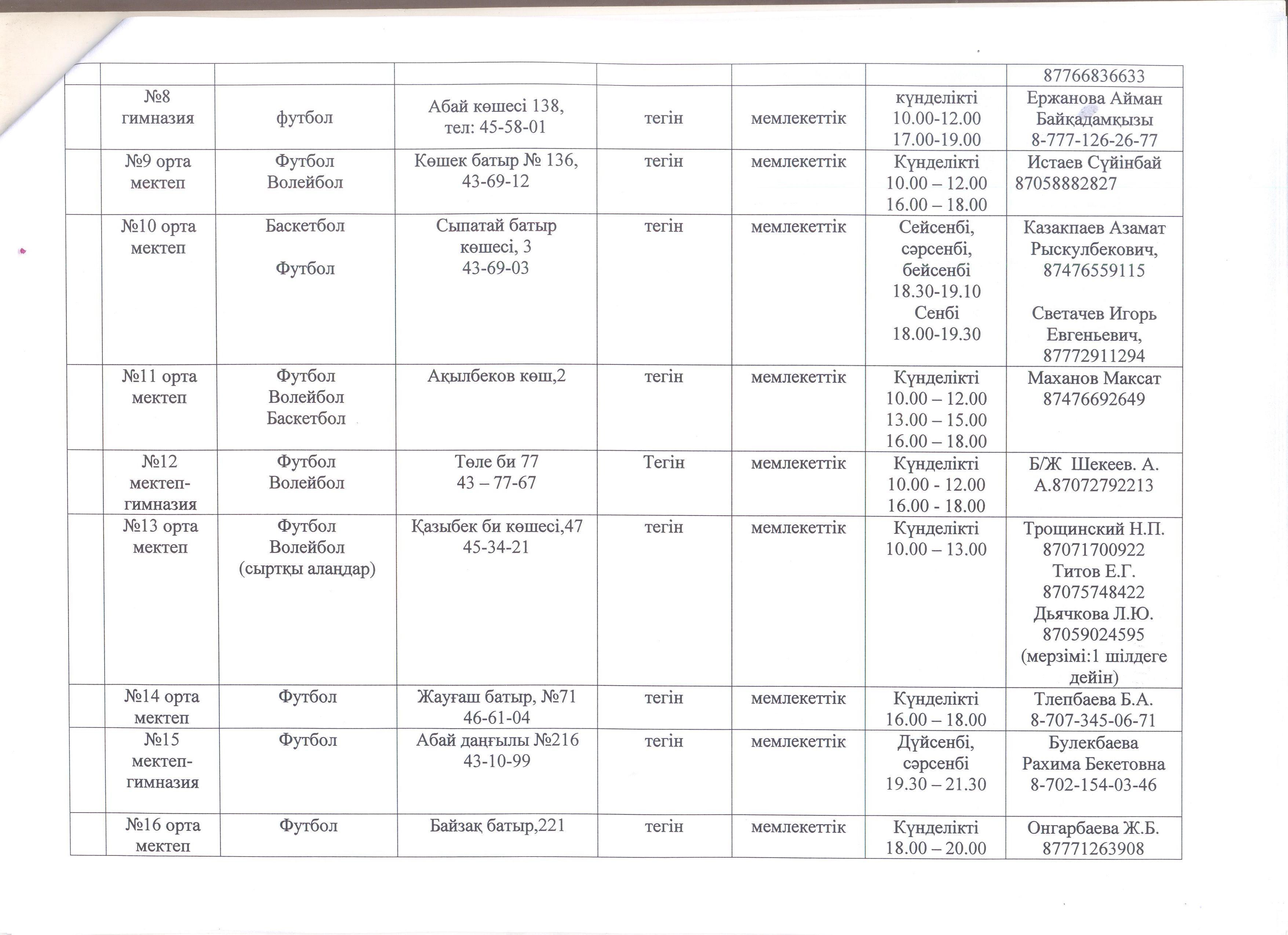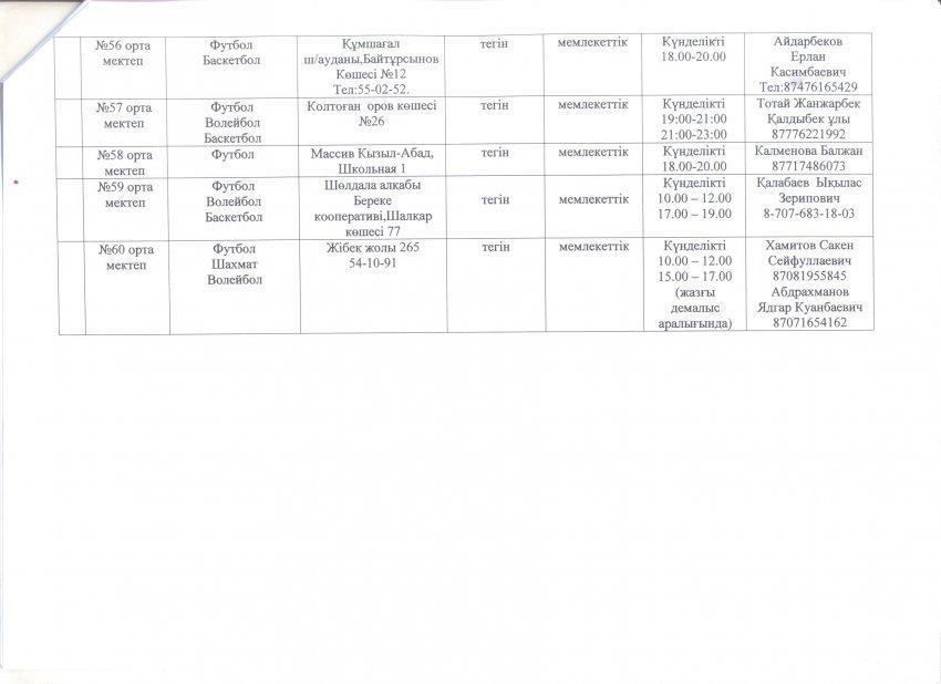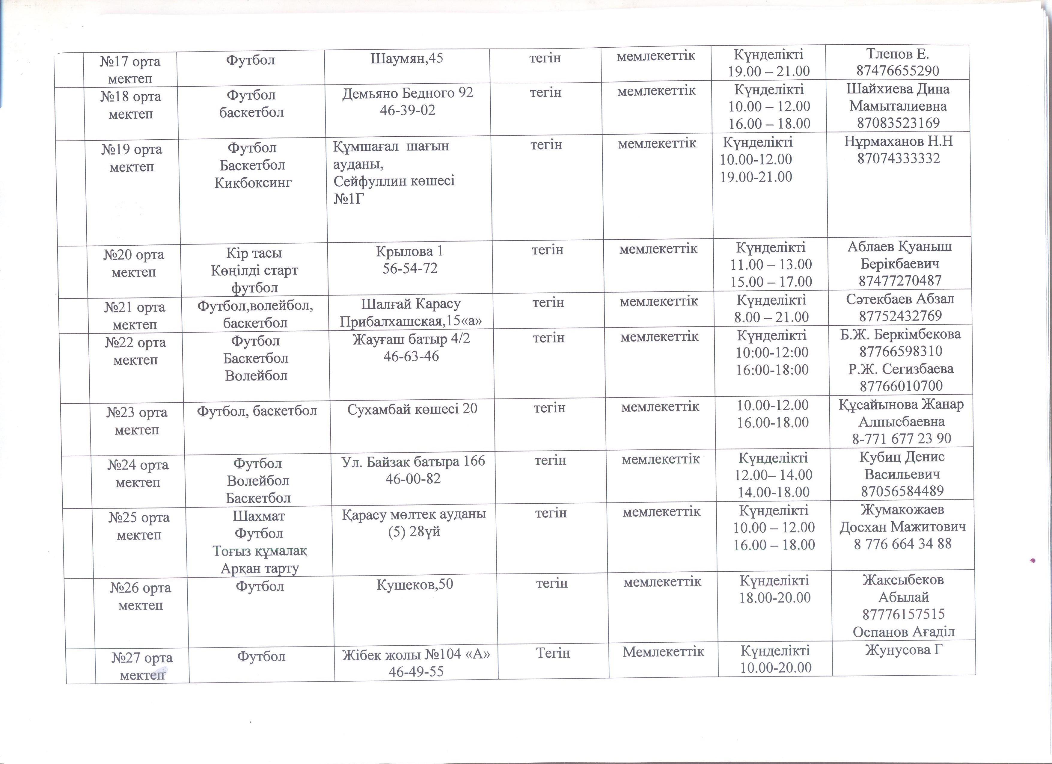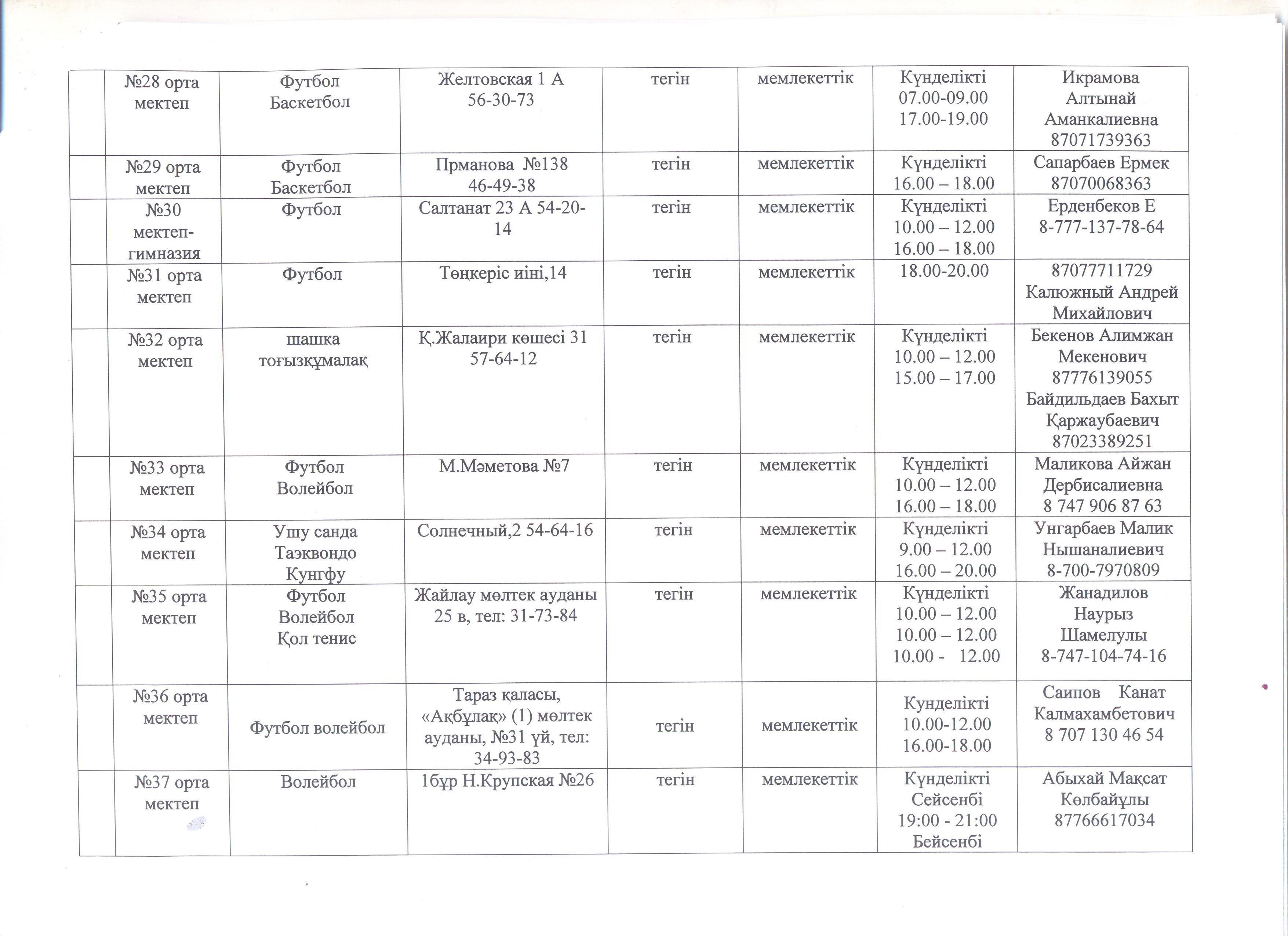 Білім беру мекемелерінде орналасқан спорт алаңшаларының тұрғындарға қол жетімді болуын қамтамассыз ету мақсатында мектебімізде маусым-тамыз айларына арналған жұмыс кестесі