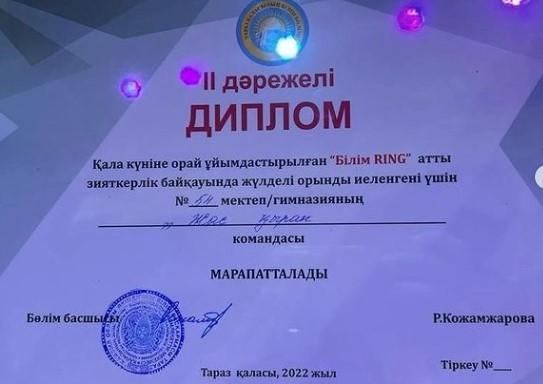 Қала күніне орай ұйымдастырылған 10 сынып оқушылары арасында өткізілген "Білім RING" атты қалалық зияткерлік байқауында мектебіміздің "Жас қыран" командасының білім алушылары ІІ орынды иеленді. Құттықтаймыз