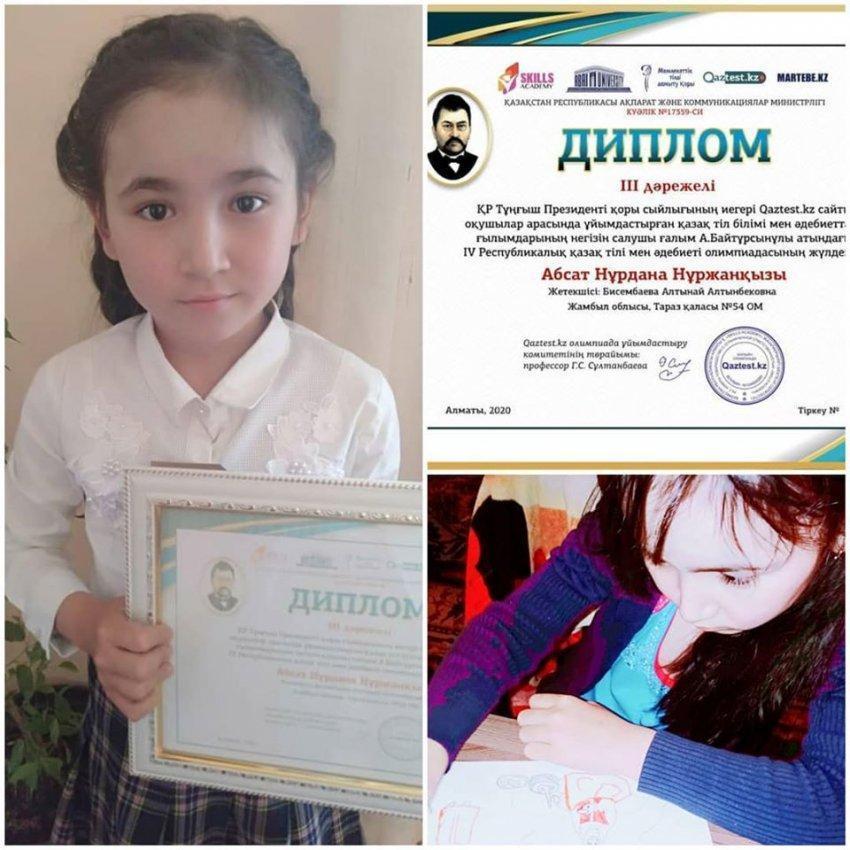 4 "Д" сынып білім алушысы Абсат Нұрдана Нұржанқызы, Qaztest.kz сайтының оқушылар арасында ұйымдастырған қазақ тіл білімі мен әдебиеттану ғылымдарының негізін салушы ғалым А. Байтұрсынұлы атындағы IV Республикалық қазақ тілі мен әдебиеті олимпиадасының ІІІ дәрежелі диплом жүлдегері, жетекшісі Бисимбаева Алтынай