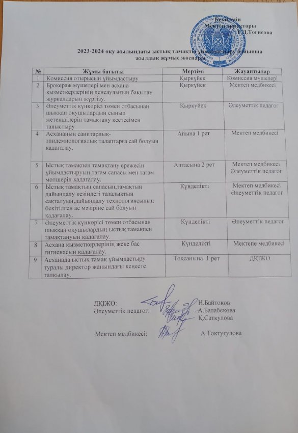 01 сентябрь 2023 0 1 2 3 4 5 2023-2024 оқу жылында білім алушылар мен тәрбиеленушілердің ыстық тамақпен қамту жұмыстарының ұйымдастыру туралы бұйрығы Жылдық жұмыс жоспары
