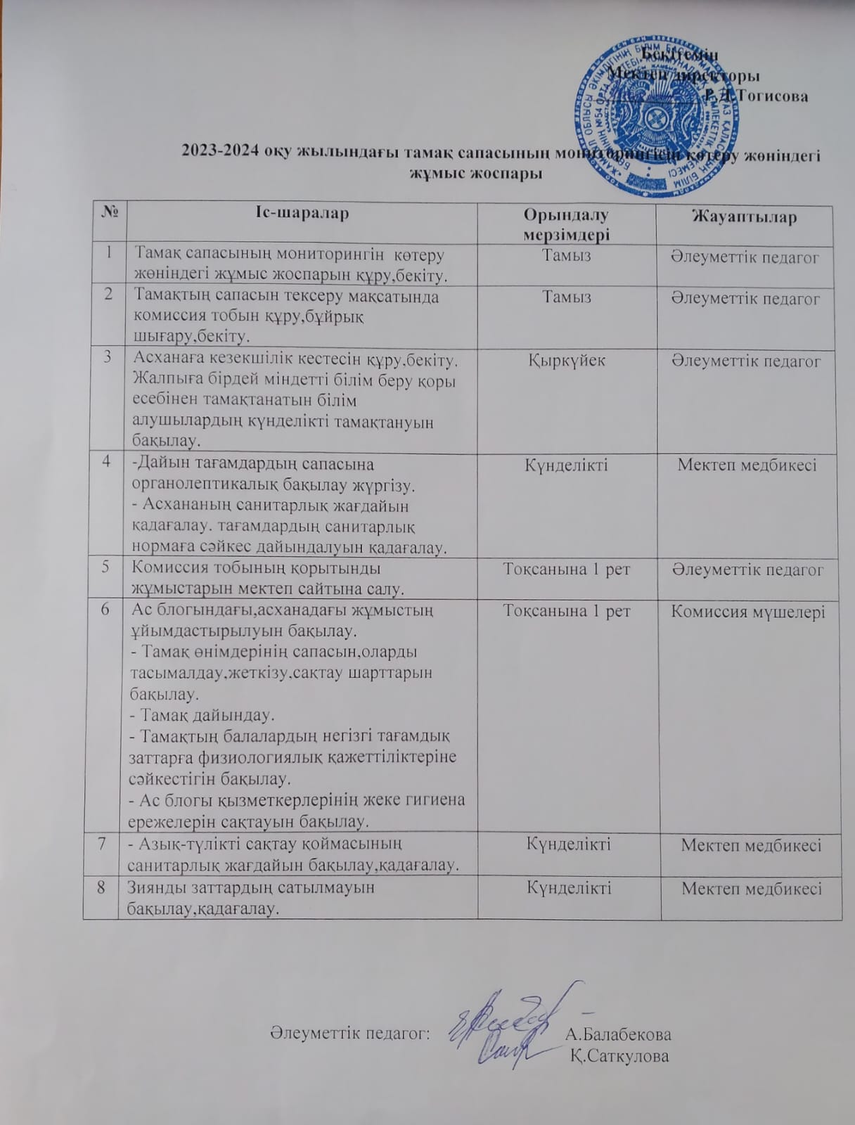 27 сентябрь 2023 0 1 2 3 4 5 2023-2024 оқу жылындағы тамақ сапасының мониторингісін көтеру жөніндегі жылдық жұмыс жоспары