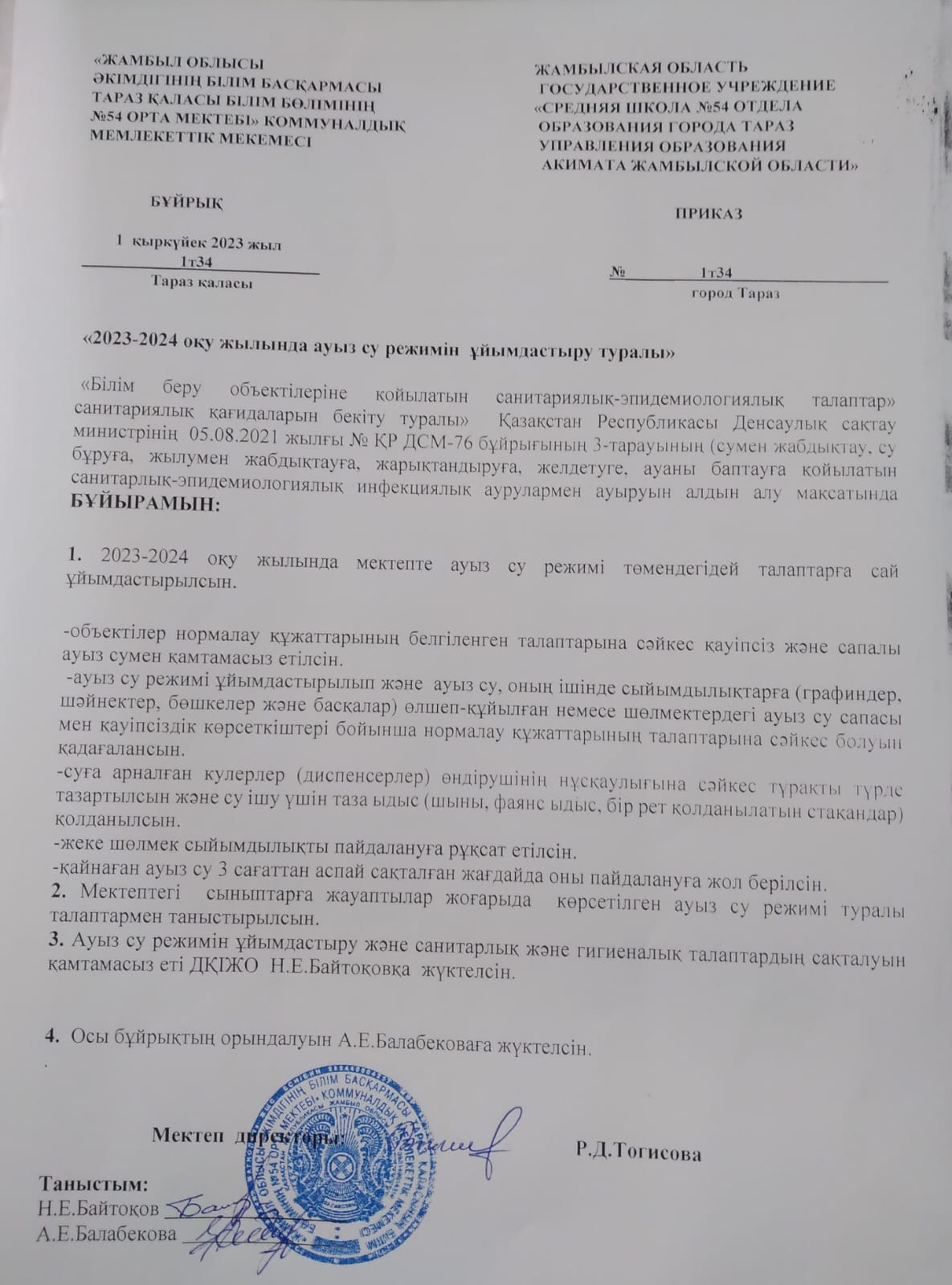 2023-2024 оқу жылында ауыз су режимін ұйымдастыру туралы бұйрығы » №54 орта мектебі
