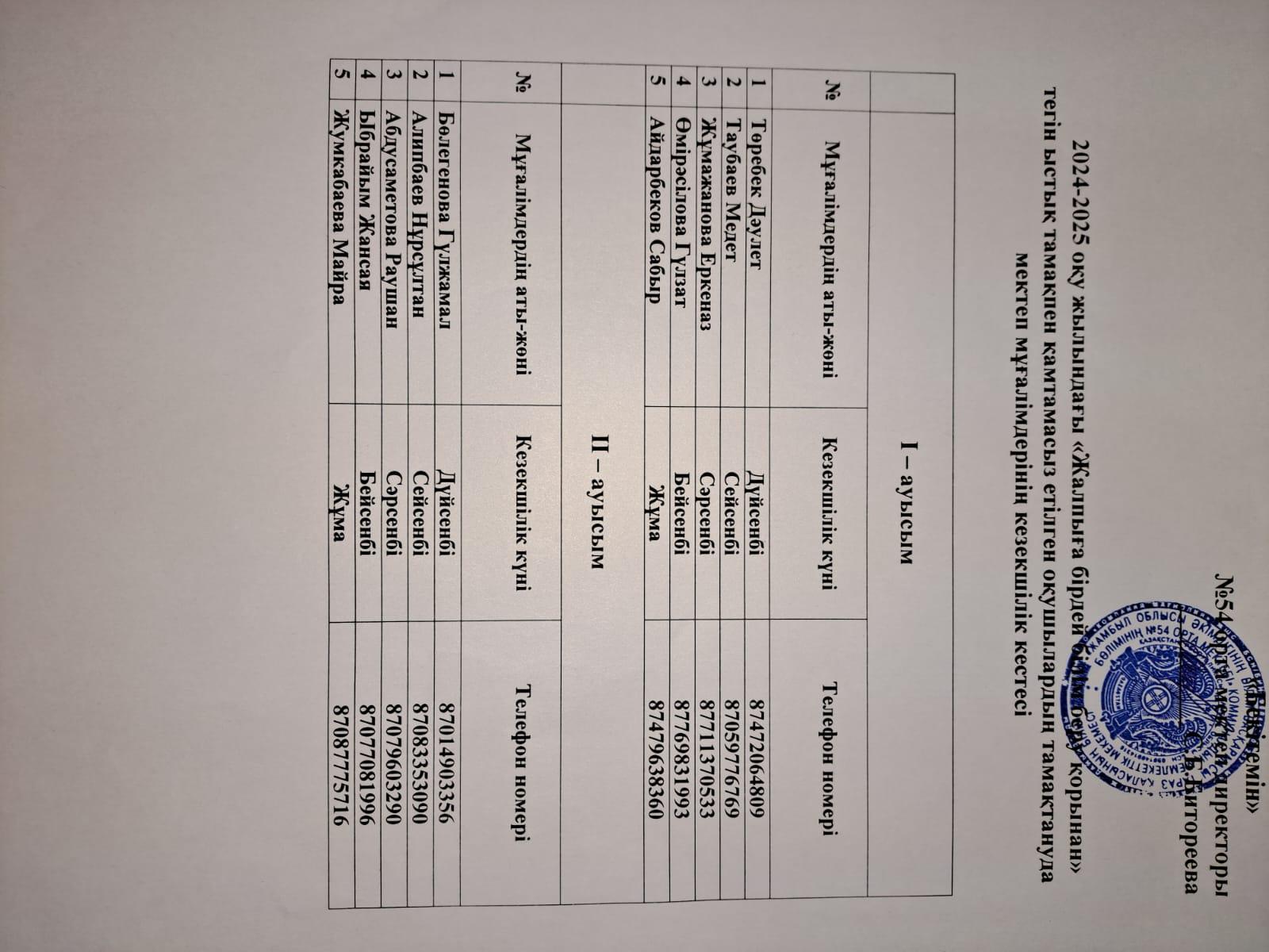 "Жалпыға бірдей білім беру қорынан" тегін ыстық тамақпен қамтамасыз етілген оқушылардың тамақтануда мектеп әкімшігінің кезекшілік кестесі » №54 орта мектебі