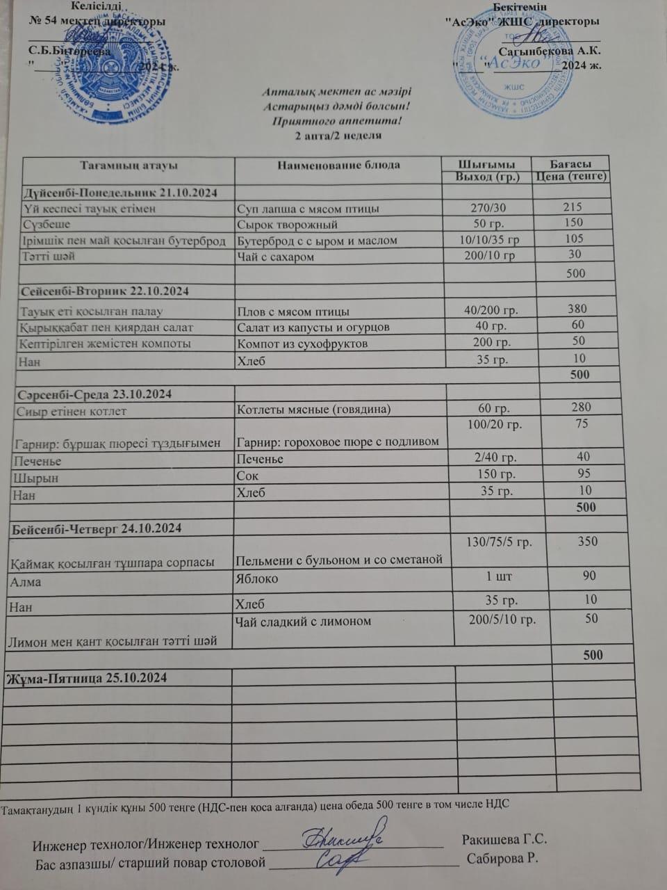 Апталық ас мәзірі 21.10-24.10.2024ж » №54 орта мектебі