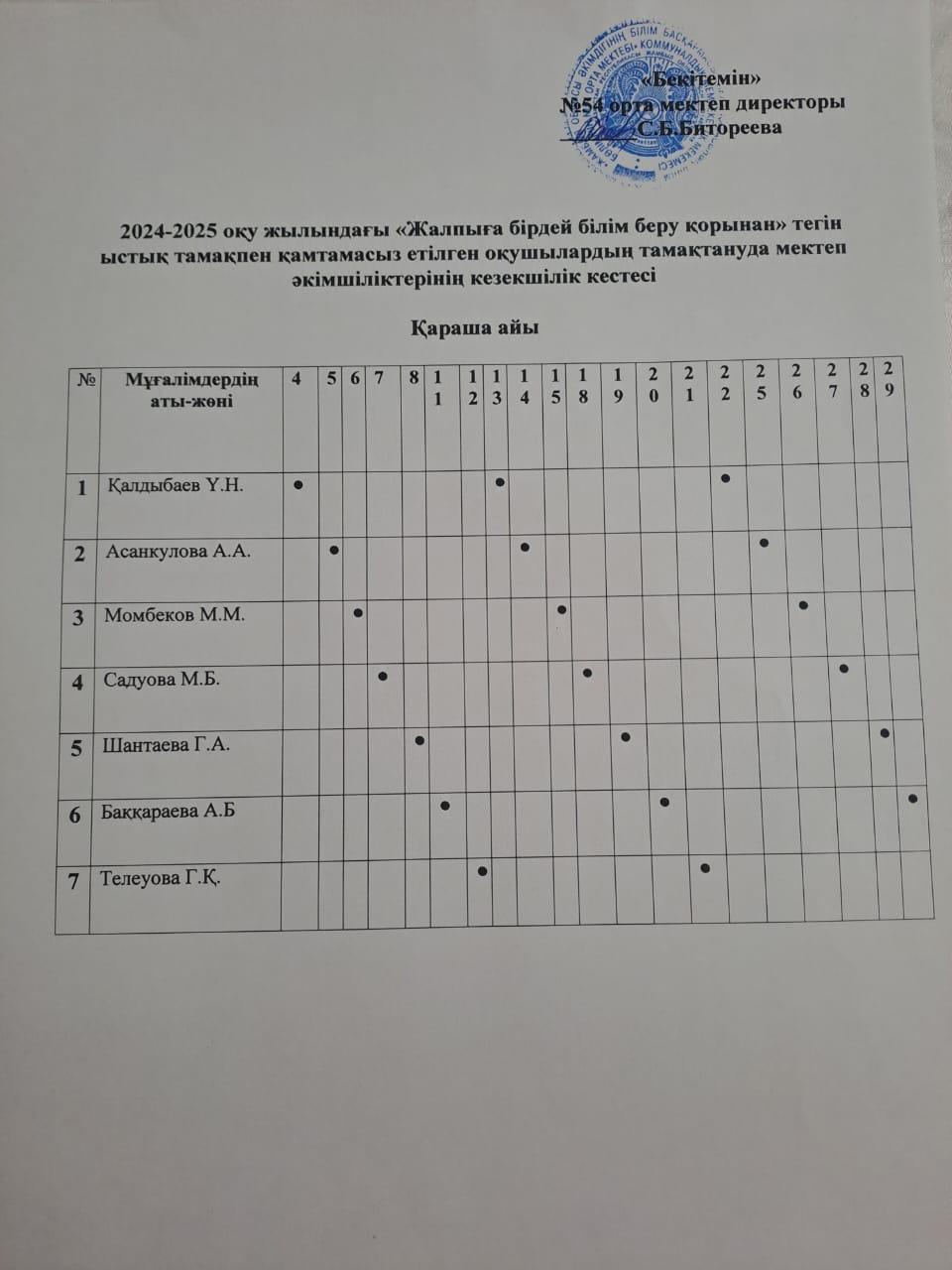 04 ноябрь 2024 0 1 2 3 4 5 Тегін ыстық тамақпен қамтамасыз етілген оқушылардың тамақтануында мектеп әкімшілігінің кезекшілік кестесі