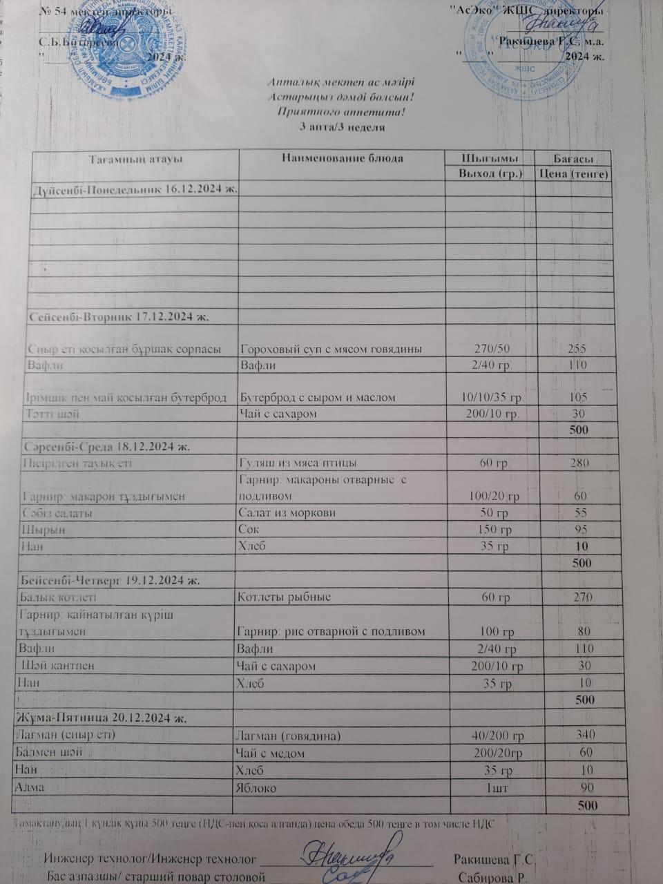 Апталық ас мәзірі 17.12-20.12.2024 ж » №54 орта мектебі