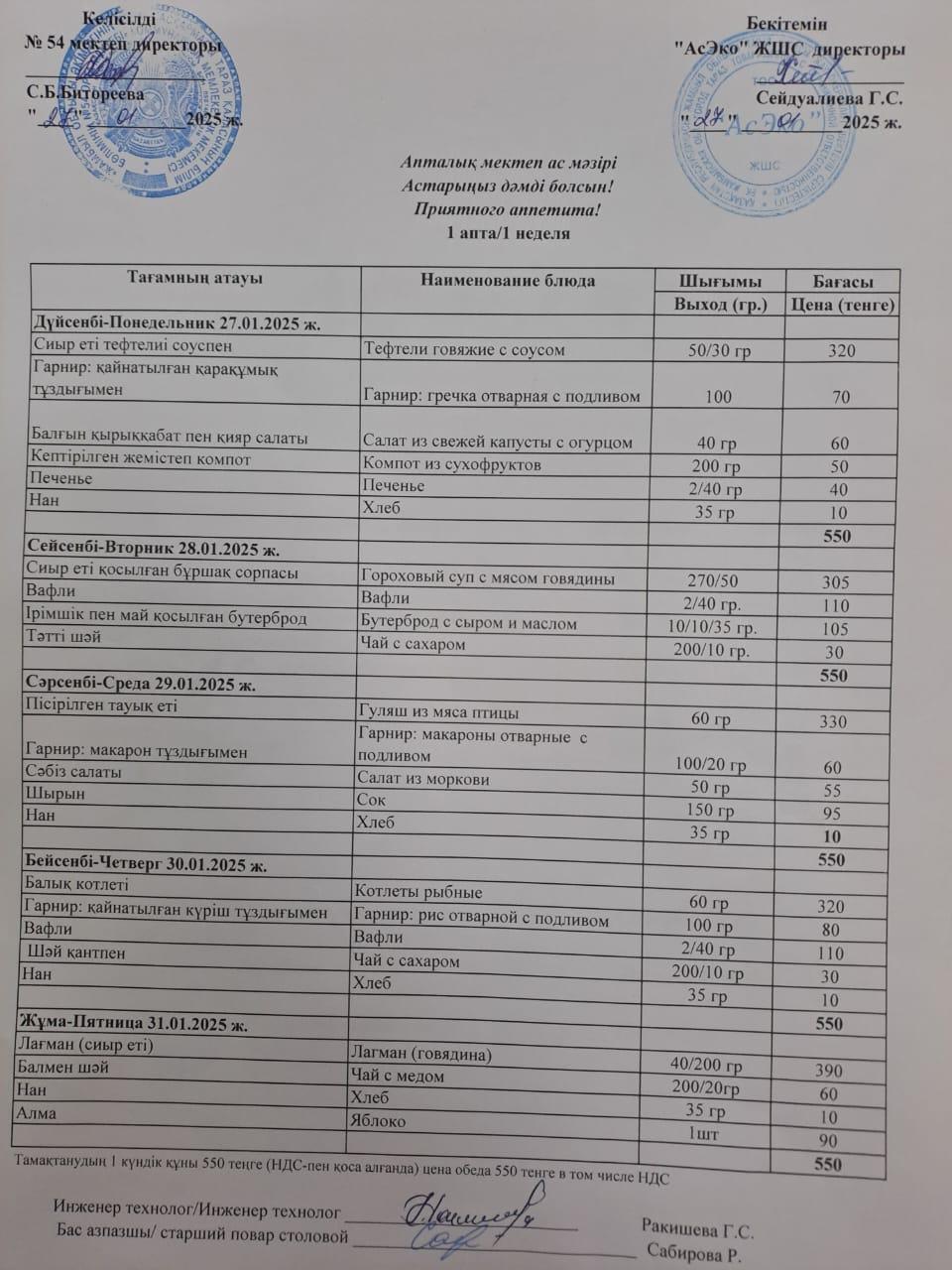 Апталық меню 27.01-31.01.2025ж » №54 орта мектебі
