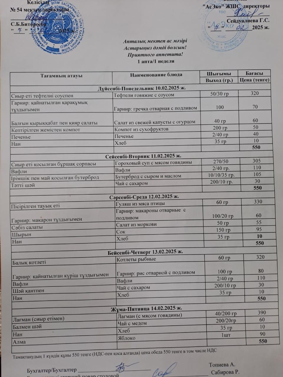 Апталық ас мәзірі 10.02.-14.02.2025ж » №54 орта мектебі