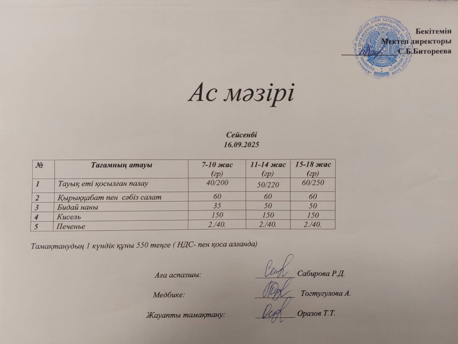 Ас мәзірі 16.09.2025 » №54 орта мектебі